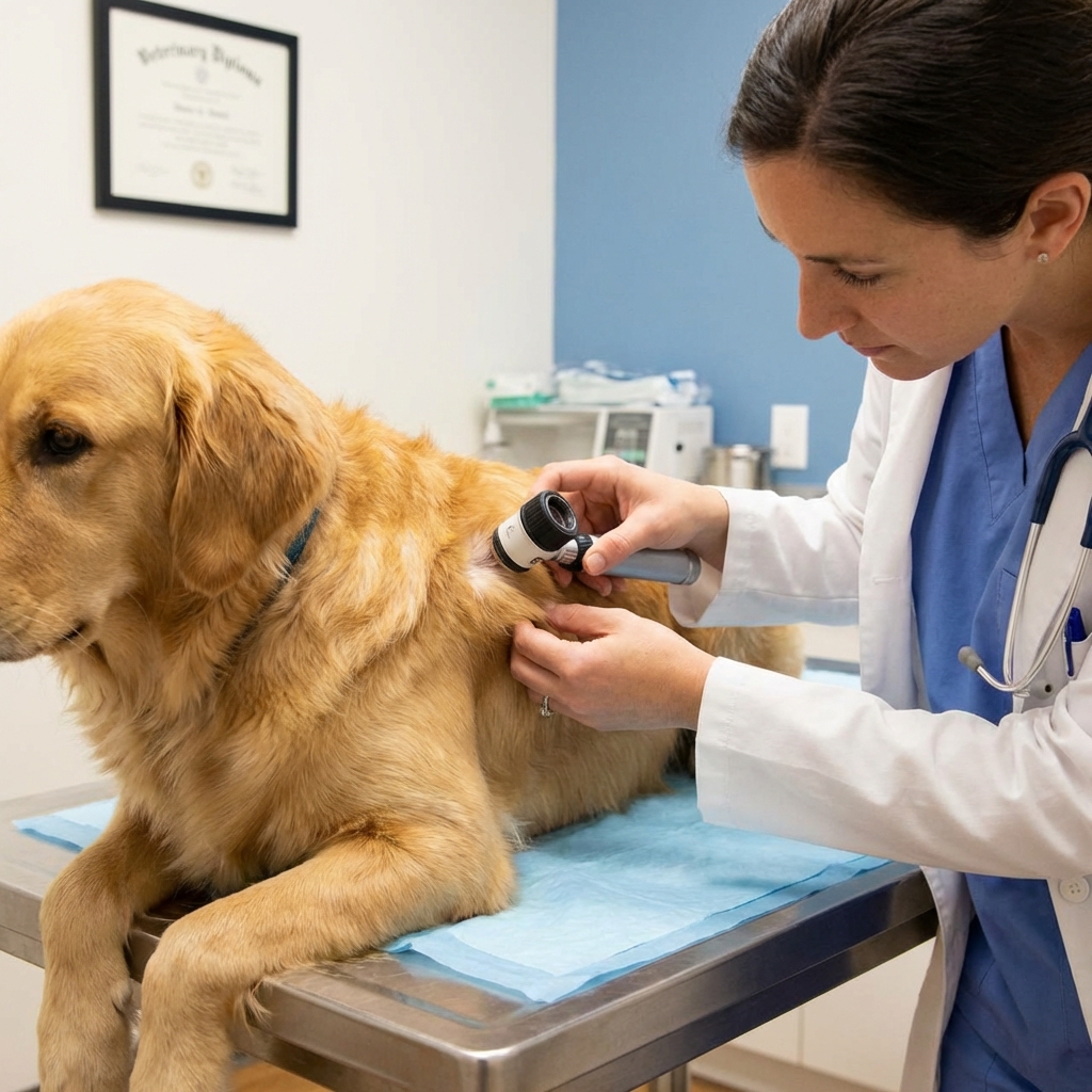 Veterinary dermatologist examining a dog's skin